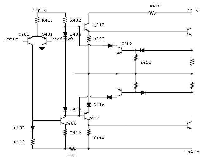 Qui sotto lo schema "corretto" (spero) con il diodo Baxandall al posto "giusto" e le protezioni - in particolare R422 e Q408 - inserite e senza i condensatori che si suppongono OK.