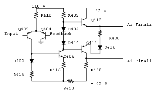 Per capire meglio la situazione è stato poi rimosso il transistor di protezione Q408 (BC337-16): l'effetto è stata l'immediata bruciatura di R422 (il cui valore, insieme a quello di R424, era stato portato a 47 ohm), indicando così che sia il pilota Q412, sia il finale che lo segue sono integri. Rimesso a posto Q408, l'amplificatore è ritornato nella condizione precedente di guasto senza però bruciare più nulla.