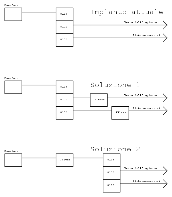 La linea di casa è un po disturbata perché facente parte di un anello industriale. Vorrei evitare che dentro l'impianto di casa entrasse qualcosa di diverso dai 50Hz. Se fattibile preferirei adottare la Soluzione 2 quindi ci vuole un filtro da 25A.