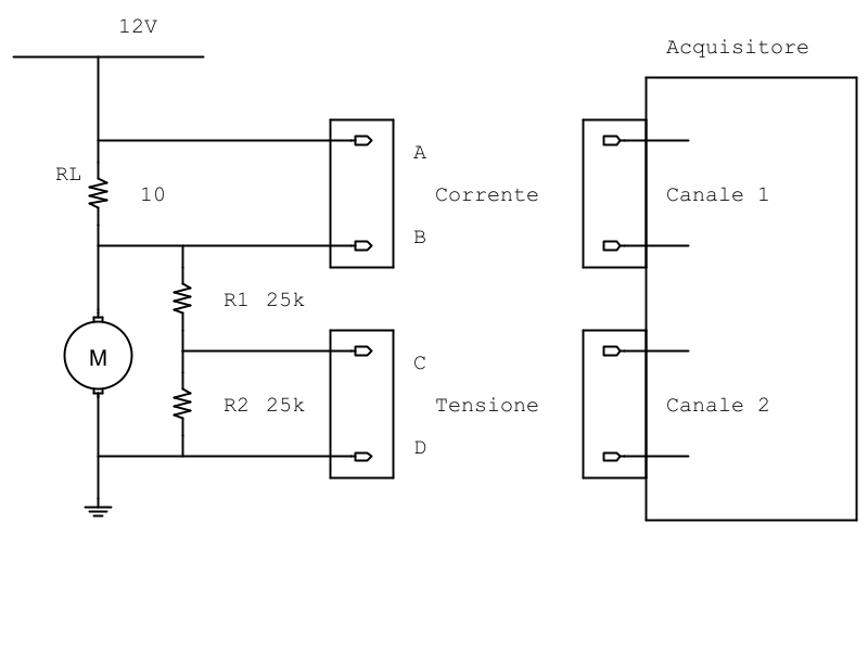 Devo misurare la corrente e la tensione di un piccolo motore elettrico a spazzole e acquisire i valori mediante due canali di acquisizione analogica.