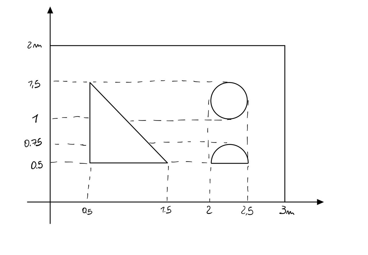 Devo sviluppare un segnale di riferimento in modo che la macchina da taglio sia in grado di estrarre un cerchio, un triangolo e un semicircolo da una lastra rettangolare. La posizione di riposo della macchina e' nell'angolo superiore destro della piastra.