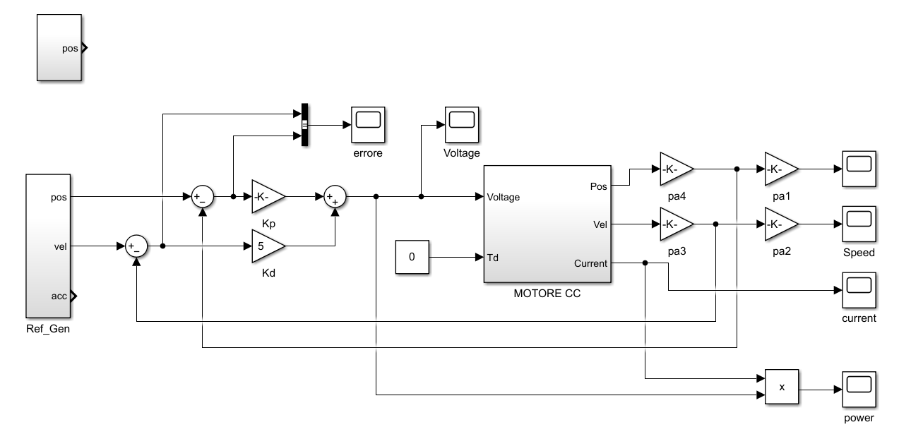 R = 1 ohm; L = 1 mH; J = 0,1; B = 0,029 (motore + carico) ; Ke = 0,6 (Vs)/(rad) ; Kt = 0,6 (N·m)/(A) ; Pmax = 4KW;