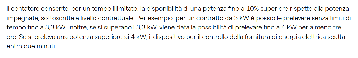 paolo a m dice: "Il contatore dell'Enel (parliamo di quello elettronico) consente, per un tempo illimitato, la disponibilità di una potenza superiore del 10% rispetto alla potenza impegnata contrattuale. Per un contratto da 3 kW è possibile prelevare senza limiti di tempo fino a 3,3 kW. Se si superano i 3,3 kW, viene data la possibilità di prelevare fino a 4 kW per almeno tre ore".