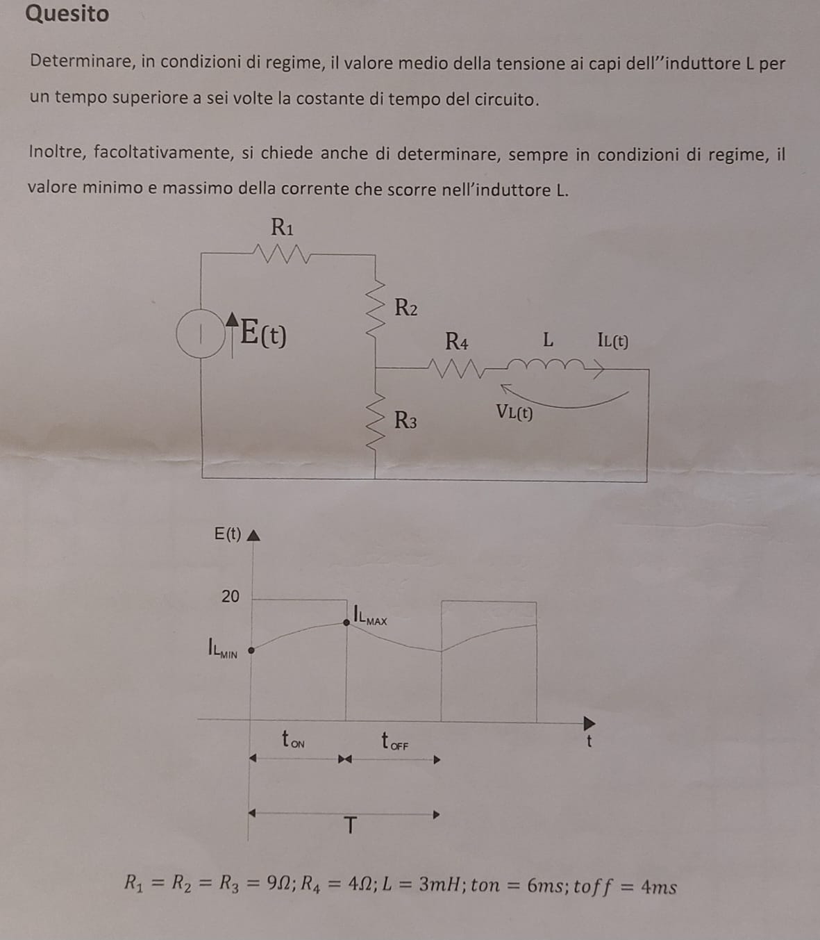 Buonasera a tutti, sto provando a risolvere questo esercizio, ma sono parecchio indeciso sullo svolgimento della seconda richiesta, ovvero di calcolare la corrente minima e massima che scorre nell'induttore a regime.