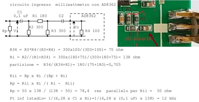 Questo trasformerebbe il partitore a pigreco in un partitore "quasi" a T, sfruttando anche l'impedenza di ingresso dell'AD ... pero' poi serve vedere se l'indicazione rimane coerente (ne dubito assai) o se c'e' da modificare il software per ricalibrare tutto, perche' gia solo con la resistenza saldata al connettore, avresti un'attenuazione del 50% (dovrebbero essere sui 6dB), mentre ad occhio (odio i calcoli