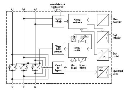 Il funzionamento è semplice : utilizzando degli SCR si parzializza la tensione di alimentazione degli avvolgimenti di statore, regolando l’ampiezza agendo sul gate degli stessi SCR. A fine avviamento un contattore provvede a bypassare i componenti elettronici per limitare le perdite. Il fatto di poter variare linearmente la tensione piuttosto che con 2 gradini (come nel convenzionale avviamento stella-triangolo) consente di eliminare il picco di corrente dovuto alla commutazione.