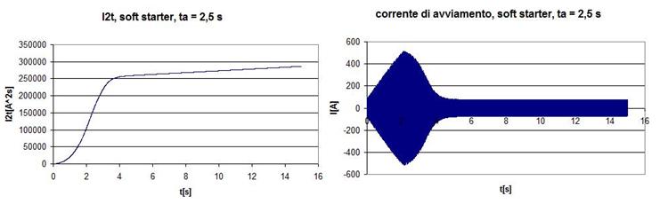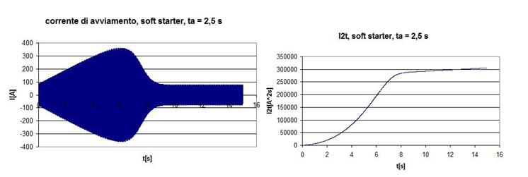 La corrente di avviamento risulta estremamente contenuta e supera di circa il 20 % il valore della corrente nominale. L’ I2 t risulta circa la metà rispetto al caso precedente e circa 1/5 rispetto all’inserzione diretta in rete.