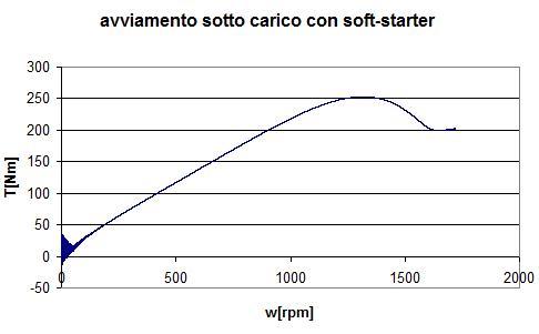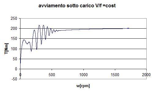 La corrente allo spunto risulta oltre 5 volte quella nominale, non molto inferiore a quella conseguente all’avviamento diretto. Possiamo inoltre riportare la curva dei punti (T-w) all’avviamento per evidenziare come questo tipo di controllo riduca fortemente la coppia allo spunto, nonostante la presenza del voltage-boost (Fig.3.4).