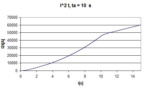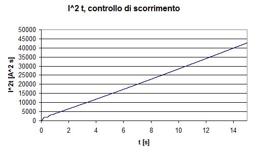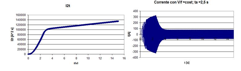 Per evitare di appesantire i calcoli solo un campione ogni 10 di corrente è stato importato in excel; ciò ha comportato un evidente aliasing, del resto ininfluente ai nostri scopi : il massimo picco di corrente risulta di 600 A, pari a 10 volte il valore efficacie della corrente nominale; la corrente allo spunto (RMS) vale quindi circa 7 volte la corrente di regime (RMS). Il tempo di avviamento risulta comunque non trascurabile; andando a calcolare l’ I2 t come integrale di I2 otteniamo (Fig 2.2) :