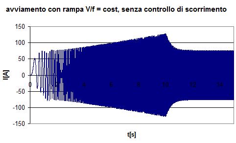 Notiamo come, per avviare il motore in un tempo paragonabile a quello con l’inserzione diretta con questo metodo di controllo, sia comunque necessaria una corrente allo spunto notevolmente superiore a quella nominale (a causa di un eccessivo scorrimento), benché inferiore a quella necessaria con avviamento diretto da rete. L’ I2 t al termine della fase di avviamento risulta infatti 2,5 volte inferiore rispetto all’avviamento diretto.
