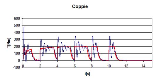Per determinare se questa risposta inadeguata sia dovuta ai limiti di coppia e potenza della macchina od alle prestazioni del controllo, si analizza l’andamento della coppia : è evidente come il transitorio elettromagnetico, dovuto all’avere ignorato la posizione del flusso di rotore, causi delle oscillazioni di coppia che di fatto penalizzano la risposta dinamica della macchina. Tale errore è tuttavia molto minore nel caso si utilizzi il feedback di velocità piuttosto che quello di corrente, come si puo’ notare osservando l’andamento della coppia relativo alla simulazione già riportata in termini di velocità e corrente nelle figure 6.5 e 6.6 (Fig.7.3).