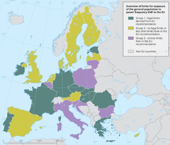 - Belgio: limiti su base regionale, applicati alle nuove costruzioni, variabili tra 100 μT e meno di 3 μT.