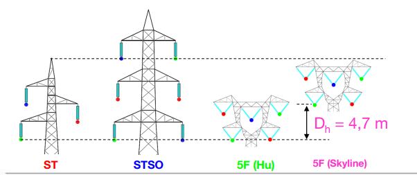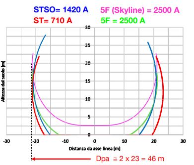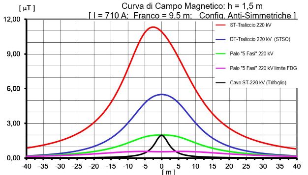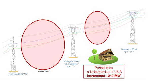 Se il confronto è fatto a parità di altezza (skyline) di un sostegno tradizionale, la riduzione è ancora più marcata, con valori di campo magnetico inferiori rispetto a quelli di una linea in cavo interrato.