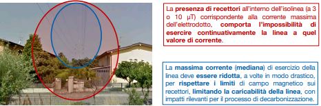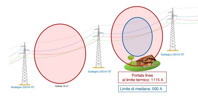 In un caso «tipico» che useremo come esempio ipotetico, la presenza di un recettore su una campata di una linea a 220 kV, ne limita la mediana di esercizio da 1115 A (limite termico invernale del conduttore) a 500 A, con una riduzione della caricabilità dell’intera linea.