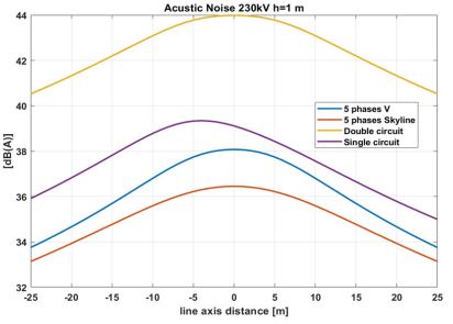 Gli elettrodotti di alta ed altissima tensione producono rumore per via della ionizzazione dell'aria sui conduttori di fase (effetto Corona). Tale generazione di rumore, per gli elettrodotti in corrente alternata di moderna progettazione, risulta praticamente rilevante solo in condizione di conduttore bagnato. Al fine di minimizzare l’impatto antropico degli elettrodotti, i nuovi sostegni a 5 Fasi sono stati progettati in modo da garantire bassi livelli di rumore e di radiointerferenza, inferiori rispetto a quelli degli elettrodotti convenzionali che sono chiamati a sostituire e compatibili con l’esercizio anche in aree fortemente antropizzate. In particolare, il rumore risulta inferiore a 40 dBA, pertanto compatibile con zonizzazioni residenziali in accordo alla legislazione vigente, anche con conduttori bagnati, in ogni punto al di sotto delle linee. Il grafico sotto riportato mostra come il rumore prodotto da elettrodotti a 5 Fasi sia inferiore rispetto a quello di soluzioni convenzionali; ciò distingue nettamente la soluzione a 5 Fasi da altre soluzioni (ad esempio adottata all'estero) per la mitigazione dei campi magnetici che tendono invece ad aumentare il rumore prodotto per effetto corona.