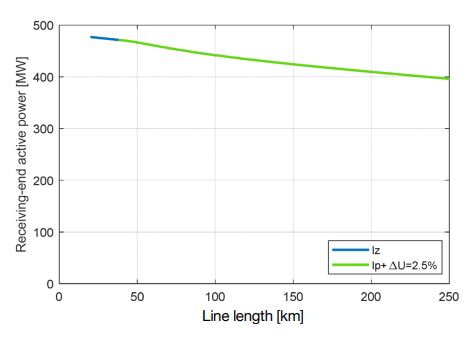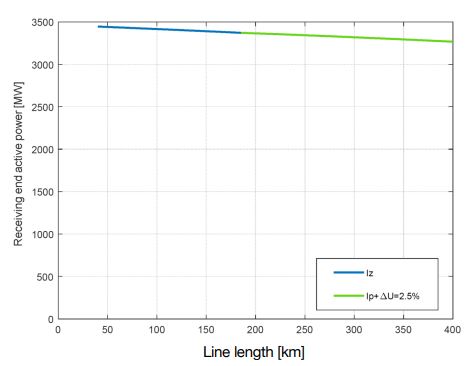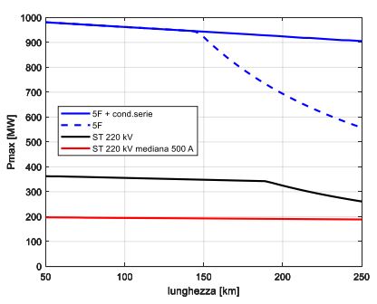 I primi elettrodotti a 132 e 150 kV della rete Italiana ricoprivano un ruolo di trasmissione (generazione idroelettrica) ed interconnessione tra isole di carico. Gli elettrodotti a 150 kV rappresentano oggi il fulcro della rete di subtrasmissione, cui è demandato il compito di raccolta della generazione distribuita. Adottando una compensazione serie lungo la linea, è possibile trasmettere circa 400 MW lungo una distanza di circa 250 km, rispettando i vincoli sulla portata al limite termico e considerando un limite estremamente stringente sulla caduta di tensione (2.5%). In questo modo, il rinnovo di elettrodotti «storici» a 132 e 150 kV prossimi al termine della vita tecnica utile, con sostegni a 5 Fasi ne consentirebbe nuovamente l’impiego perfunzioni di trasmissione oltre che per una maggiore raccolta di energia rinnovabile. Come visibile nel grafico sotto riportato, il vincolo di massima corrente (Iz) dei conduttori risulta vincolante solo per linee corte (curva blu del grafico), mentre per lunghezze maggiori è la caduta di tensione a dettare la massima potenza trasmissibile (curva verde del grafico).