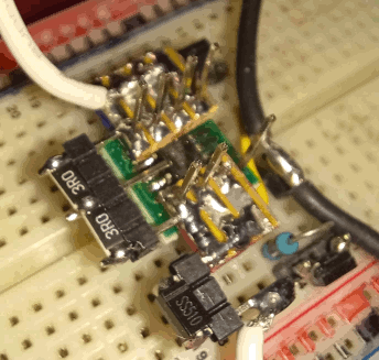 Il prototipo è stato costruito utilizzando un misto di saldature e collegamenti su breadboard: