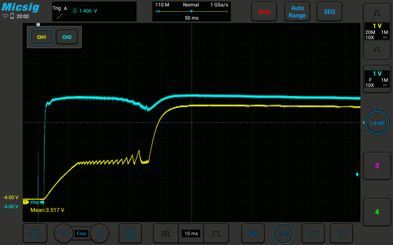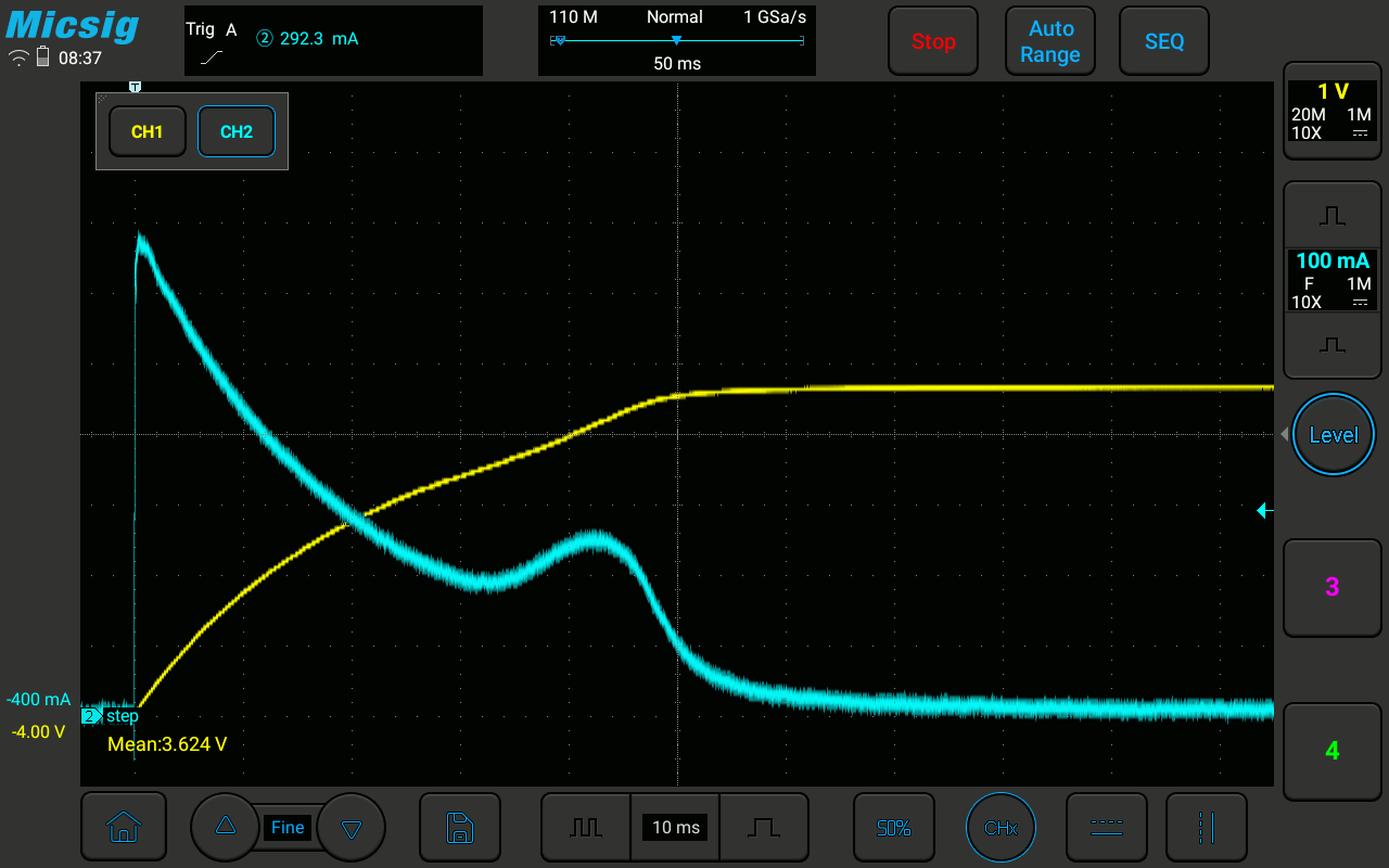 In questo caso non ho potuto misurare la corrente ma mi sono limitato a misurare la tensione in ingresso (CH2) e quella ai capi del condensatore (CH1).