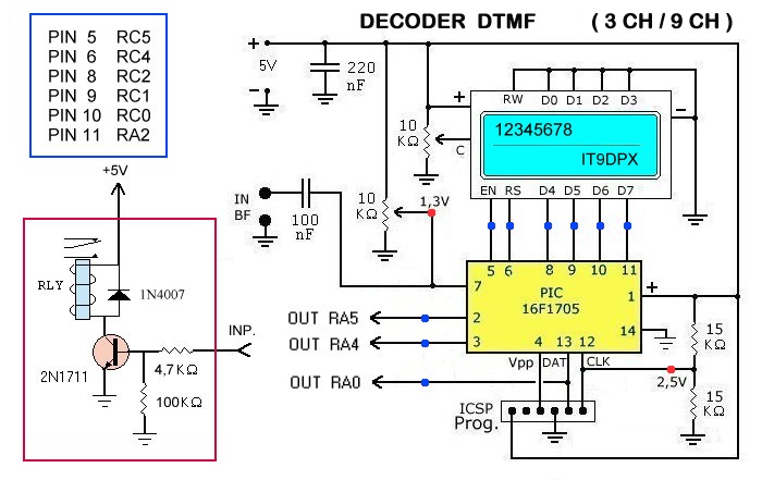 Se invece vi occorrono più di tre canali, allora dovrete caricare sul pic il file “dtmf decoder 9 ch.hex”, che vi permetterà di ottenere fino a nove canali. In questo caso dovrete rinunciare al display, che potrete togliere, e collegare oltre ai tre pin menzionati prima, anche gli altri pin 5, 6, 8, 9, 10 e 11, evidenziati nel circuito elettrico col pallino blu e sulla basetta con le frecce nere.