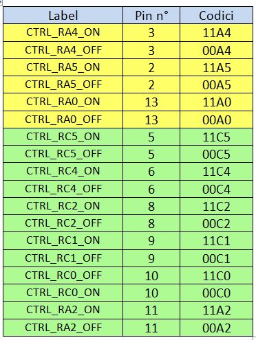 Ad ogni canale sono associati due distinti codici, uno per l’attivazione e l’altro per la disattivazione del pin del pic corrispondente. Durante le mie prove, per rendere meno complesse le operazioni di messa a punto dei software in questione, ho deciso di usare dei codici strutturati secondo una logica, che mi permettesse di individuarli e riconoscerli subito.