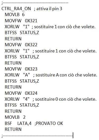 Troverete anche la parte di programma che inizia con la label CTRL_RA4_OFF che spegne il pin 3 del pic. In entrambi i casi, andrete a modificare i quattro caratteri tra apici, preceduti dall’istruzione XORLW.