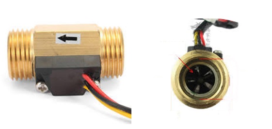 Il flussometro, almeno quello che ho usato io, si presenta come un manicotto di ottone credo, lungo 7 cm circa, di ¾ di pollice, con una girante al suo interno posta eventualmente in rotazione dal flusso d’acqua in transito. All’esterno, solidalmente avvitato sul manicotto, vi è un sensore di “Hall” che senza alcun contatto meccanico, ma solo per effetto del campo magnetico di cui è dotata la girante interna, restituisce all’uscita un segnale elettrico di tipo impulsivo, il cui numero di impulsi è proporzionale al flusso d’acqua in transito all’interno del manicotto. I tre fili rosso, nero e giallo provenienti dal sensore, sono collegati rispettivamente al positivo ed al negativo di alimentazione a 5 V ed il filo giallo da cui esce il segnale impulsivo collegato al contatore, pin 3 del PIC.