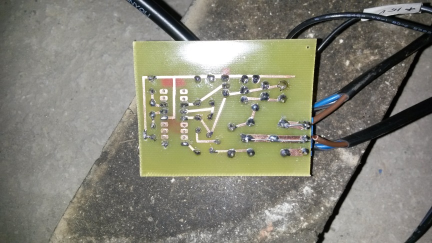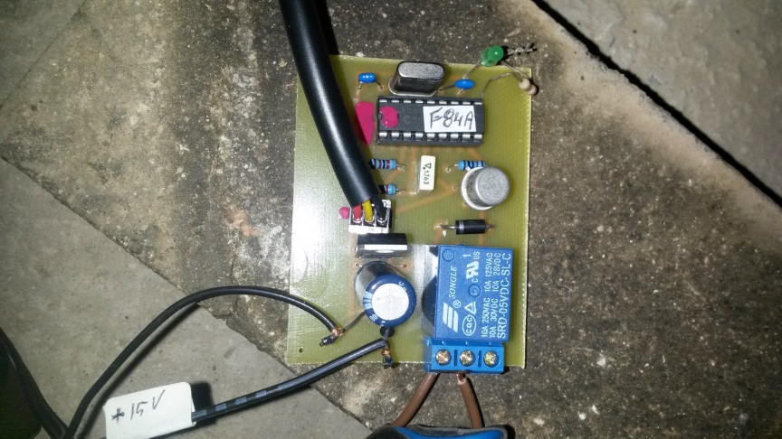 Comunque, non mi rimaneva che escogitare un qualche circuito, in grado di leggere e quindi di contare, gli impulsi provenienti dal flussometro, e di conseguenza attivare opportunamente un relè che comandasse l’avvio o l’arresto del motorino. Manco a dirlo, la scelta è ricaduta come prevedibile, su un microcontrollore prodotto dalla Microchip, il PIC 16F84 . Fantastico chip ormai obsoleto ma idoneo al nostro scopo, nel cui interno sono implementate varie funzioni, ma noi lo utilizzeremo solo come contatore d’impulsi. Il circuito elettrico è molto semplice ed è realizzato su una basetta di vetronite dalle dimensioni di 5x5 cm circa. L’alimentazione prevista può essere compresa tra 12 e 15 VDC circa, tanto nel circuito come si vede dallo schema elettrico è previsto un integrato, il 7805 che stabilizza la tensione a 5 VDC, idonea per alimentare sia il chip che il relè di attivazione del motorino.