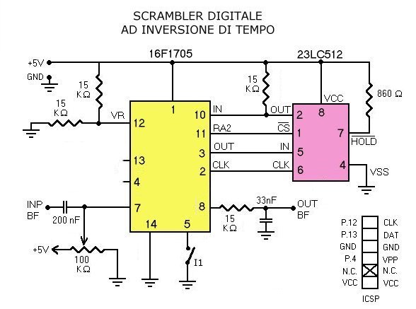 Non l’ho ancora detto, ma il circuito in esame è perfettamente reversibile come il precedente ad inversione di banda. Quindi se iniettiamo all’ingresso del pic un segnale in chiaro, tenendo chiuso l’interruttore I1, otterremo all’uscita un segnale scramblerato. Se invece iniettiamo all’ingresso del pic un segnale scramblerato, tenendo aperto l’interruttore I1, otterremo all’uscita un segnale in chiaro.
