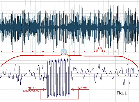 Il cortissimo bip che si ascolta ogni 4 secondi circa, dalla durata di 9 mS circa, è costituito da 16 impulsi stretti, che producono un segnale a 1777 Hz circa, ed è generato dal pic durante la codifica, ed esattamente tutte le volte che l’esplorazione della memoria SRAM passa per la locazione numero zero, vedi fig.1.