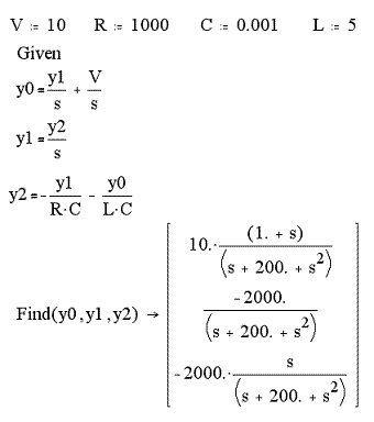 Come si vede, il sistema per trovare le espressioni in s delle 3 variabili y0,y1,y2 tiene conto delle relazioni fra queste (y0 è l'integrale di y1 più la condizione iniziale di V a gradino, e così via).