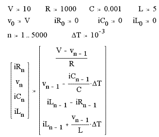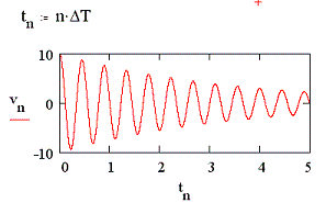La procedura in Mathcad è semplicissima: si definisce un vettore y dei valori iniziali (nel caso in esame v(0)=V e v'(0)=0), un secondo vettore D delle derivate prima e seconda, ed infine una matrice Z con la definizione della variabile (y) dell'intervallo di tempo (0-5s), del numero di campionamenti (100) ed infine il vettore delle derivate.