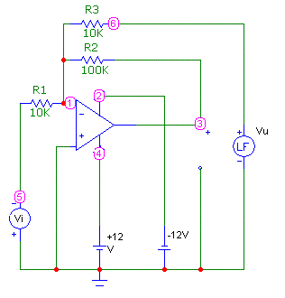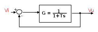 Come si vede Vi è il segnale d'ingresso (con segno cambiato per tener conto dell'inversione dovuta all'amplificatore operazionale) a cui viene "sottratto" Vu. Per l'effetto della retroazione R2, questa differenza (l'errore) viene moltiplicata per 10 (K) ed applicata alla funzione LF che simula G.