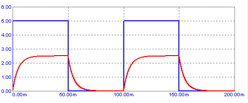 Vediamo subito un esempio semplice: la risposta di una costante di tempo ad un'onda quadra, considerando la costante 10ms (ad es. un RC da rispettivamente 1 kOhm e 10 uF), alimentato da un'onda quadra di 10 Hz.