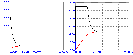 Nell'immagine di destra si ha invece il caso di Vi=5V. In tal caso l'errore iniziale moltiplicato per K richiederebbe un'uscita di 50V dal regolatore, cosa fisicamente impossibile. Si nota quindi (traccia nera) una saturazione dell'uscita che non può forzare più di tanto il tempo di salita di Vu.