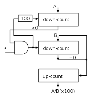 Un principio analogo può essere eseguito per le divisioni: dato A>B, si sottrae da A un numero di impulsi equivalente a B tante volte finché A non è azzerato.Contando nel terzo contatore il numero di volte in cui il contatore di B si è azzerato, si ottiene la parte intera di A/B