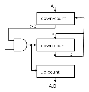 In altre parole si caricano nel terzo contatore B impulsi per ogni decremento di A, quindi quando il primo contatore è a zero, nel terzo risulteranno A.B impulsi.