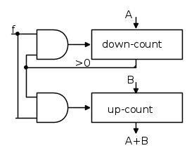 Dati infatti 2 numeri interi, A e B, basta caricare A nel primo contatore (predisposto in down) e B nel secondo (predisposto in up), e poi inviare una frequenza d'impulsi (f) agli ingressi di entrambi finché