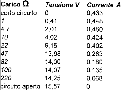 Illuminando il pannello con una lampada alogena da 1000W e variando le resistenze di carico si sono ottenuti questi valori: