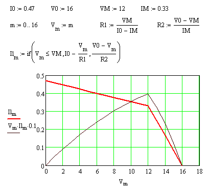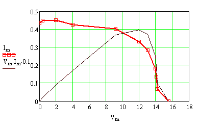 Come si puo' vedere, l'approssimazione è grossolana ma, tenendo conto della semplicità del metodo e del fatto che la zona d'interesse pratico è limitata attorno al punto di massima potenza (in questo caso tra 11 e 13V), può essere senz'altro utilizzata.