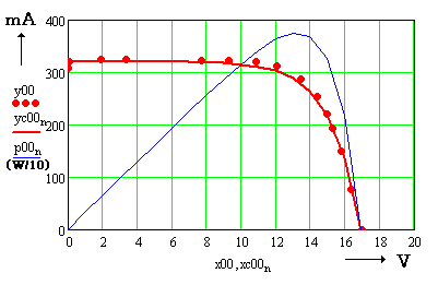 Un maggior numero di punti esaminati (a vari carichi), in particolare in quelli di massima potenza, ha portato ad una migliorata rispondenza del modello. Ecco il risultato dopo le ultime misure a pieno irraggiamento (con lampada da 1000W)