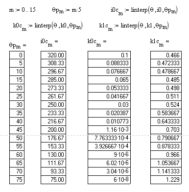 Con queste matrici è possibile ricavare una ancor più dettagliata rappresentazione (ad es per θ di 5° in 5°) con interpolazione lineare: ecco come in MathCad