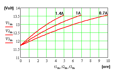 Come si può vedere, la tensione della batteria varia da 11.7V (valori inferiori non sono significativi) a 13.6V, nei tempi di carica previsti per ciascun regime di carica (gli ampere costanti indicati sopra ogni grafico).