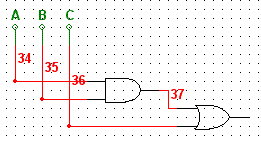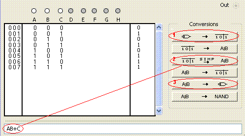 La stessa figura permette di vedere anche come si può minimizzare il circuito in modo del tutti automatico, prima col pulsante contrassegnato dal numero rosso 2, che porta alla scrittura dell'espressione minimizzata nell'ultima riga, e poi col pulsante 3 che genera il disegno automatico del circuito equivalente: