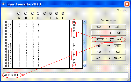 Richiamando un Logic Converter e predisponendolo per 4 variabili (A, B, C, D), appare così: