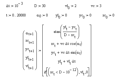 In particolare: αt ,(che stabilisce l'angolo di puntamento del cane verso la lepre), le coordinate del cane xct e yct, la posizione della lepre ylt e anche la velocita' di questa vlt(che resta sì costante durante la fuga, ma si azzera quando viene raggiunta dal cane!).
