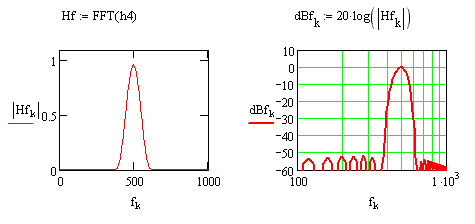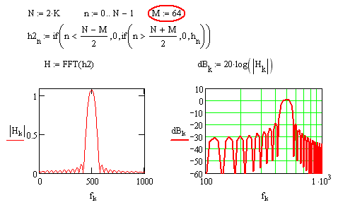 Ricostruendo il filtro (in scala lineare ed anche in quella logaritmica, cioè di Bode) si vede lo scadimento dovuto al troncamento nel numero dei coefficienti: la caratteristica di ideale ha ben poco (anche se non è poi così male, se comparato con le caratteristiche dei filtri analogici).