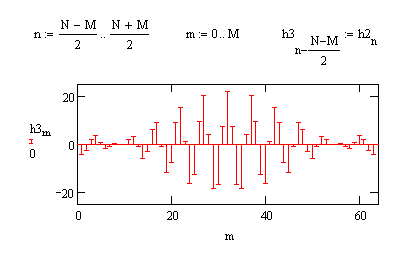 Ecco la distribuzione dei 64 coefficienti originali (h2), con indici traslati sullo zero (h3):