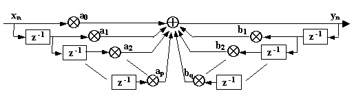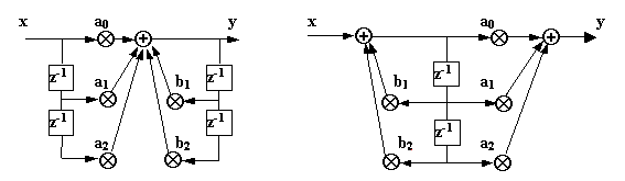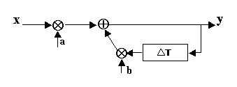 Possiamo vederne la struttura di calcolo derivante, indicando come di consueto x il segnale d'ingresso, y quello d'uscita e con a e b la costanti moltiplicative (le espressioni precedenti in parentesi):