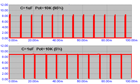Il risultato della diversa posizione del cursore nel potenziometro (Pot) è palese nella forma d'onda dell'uscita: