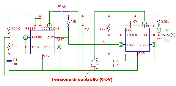 Con un primo 555 astabile si stabilisce la frequenza voluta, innescando, sui fronte d'onda negativo, un secondo 555 monostabile, la cui durata d'impulso dipende dalla tensione applicata all'ingresso di controllo (pin 5)